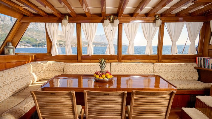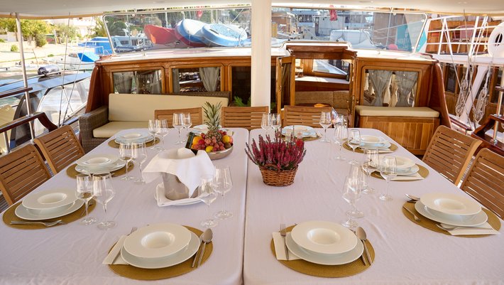 Spacious sitting area (leisure sofa) at stern and dinning table for 14 people.