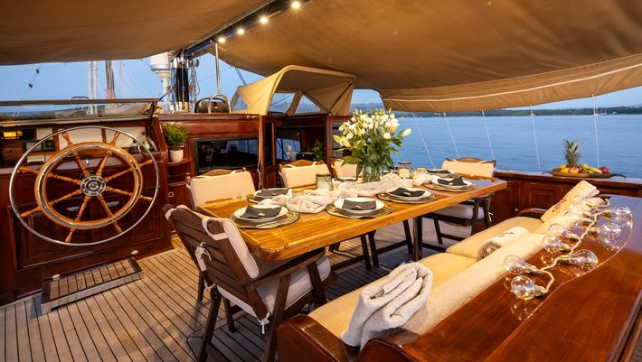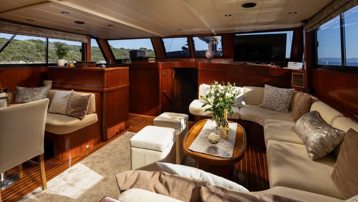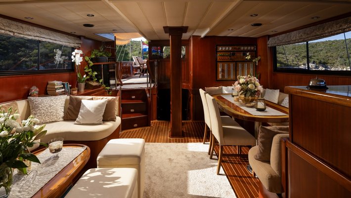 Spacious sitting area (leisure sofa) at stern and dining table for 9 people.