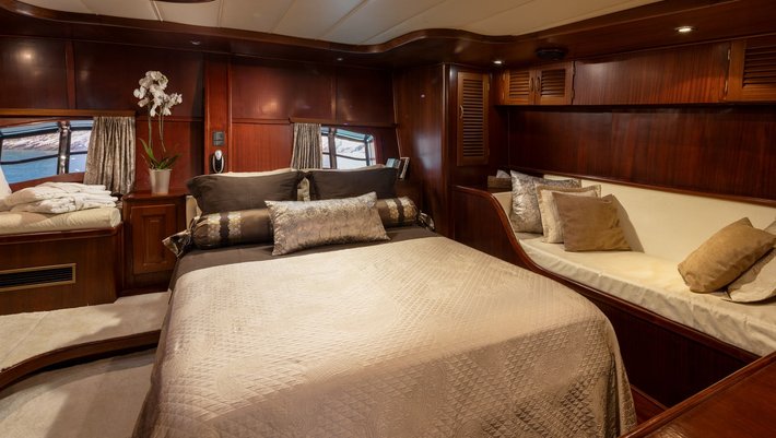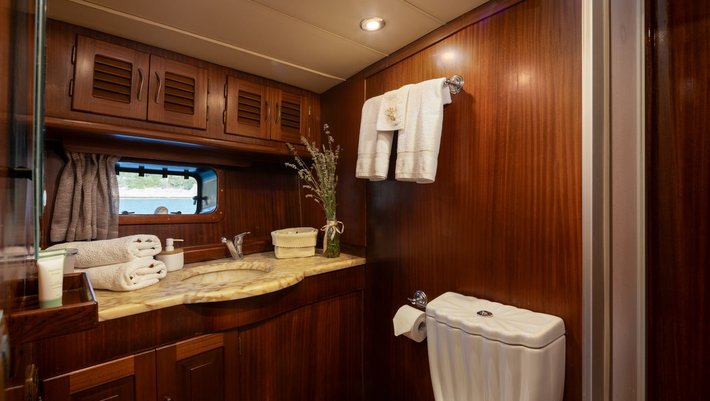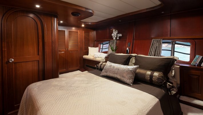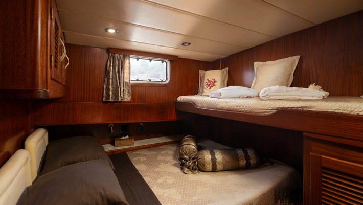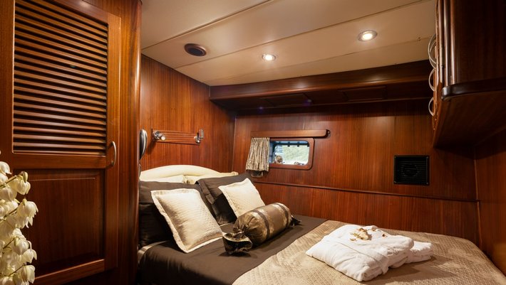 4 cabins: 1 master cabin (200×140 cm), 2 double bed cabins (200×140 cm), 1 twin bed cabin (190×70 and 200×80 cm) with extra pullman bed (190×70 cm). All with en suite bathrooms. Capacity 8+1 people.