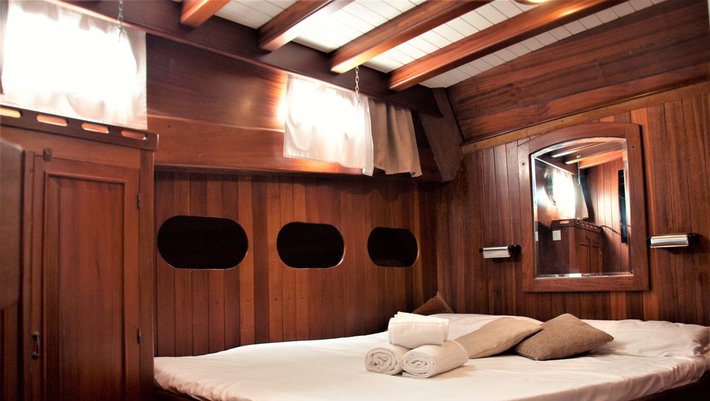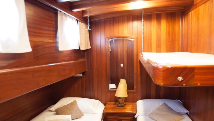 5 double cabins: 1 master + 2 triple + 1 double + 1 twin, all with ensuite bathrooms and air conditioning.