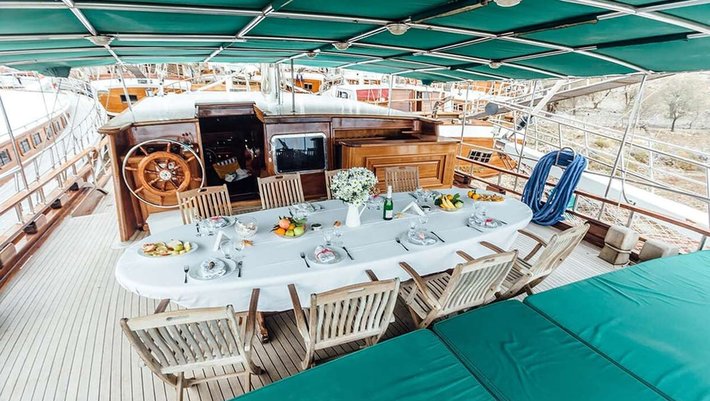 Spacious cushioned seating area and dining table at the rear of the boat.