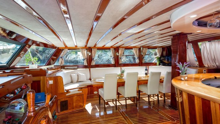 Amplia zona de sofá en popa, con mesa y sillas de teca para 12 personas.
