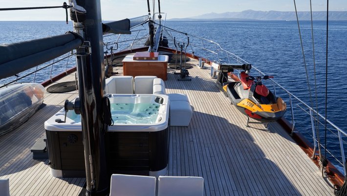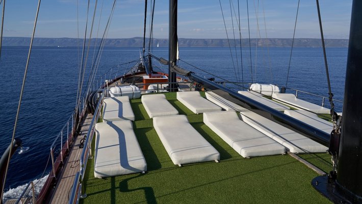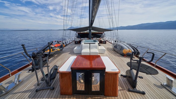 En proa dispone de otra zona de comedor y sillones de estar. El solarium se ubica en la cubierta superior, confiriéndole una mayor intimidad.