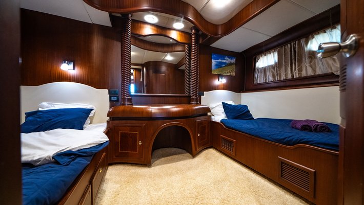1 camarote doble con 2 camas individuales de 190cm de largo x 100 cm de ancho. Tamaño de cabina: 10.3m2