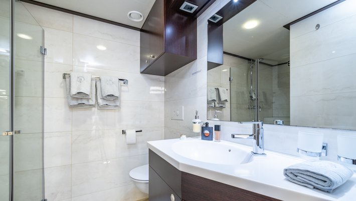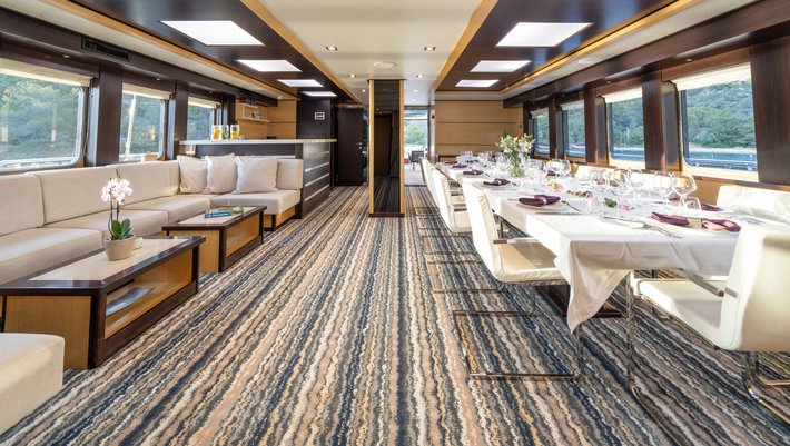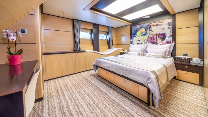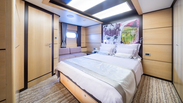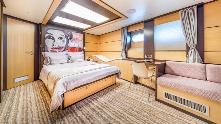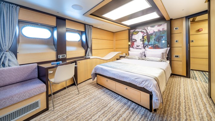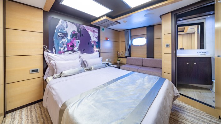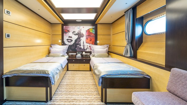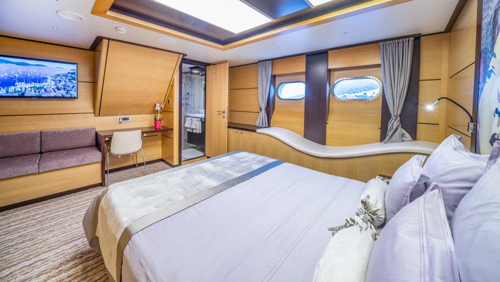 6 amplísimos camarotes dobles todos con baño en-suite: 5 con cama de matrimonio y 1 con 2 camas individuales. Televisión y aire acondicionado independiente en cada camarote. Servicio de habitación.