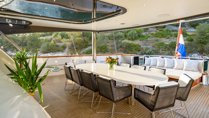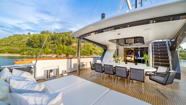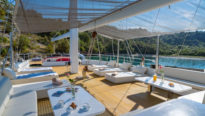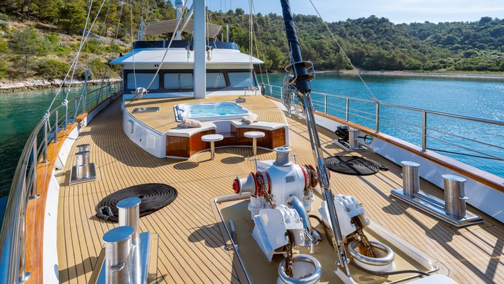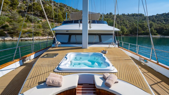 En la popa se encuentra el comedor exterior, mientras que en la proa podrán disfrutar de un jacuzzi para 4 personas, colchonetas de sol y un pequeño banco con mesita, ideal para tomar el aperitivo.