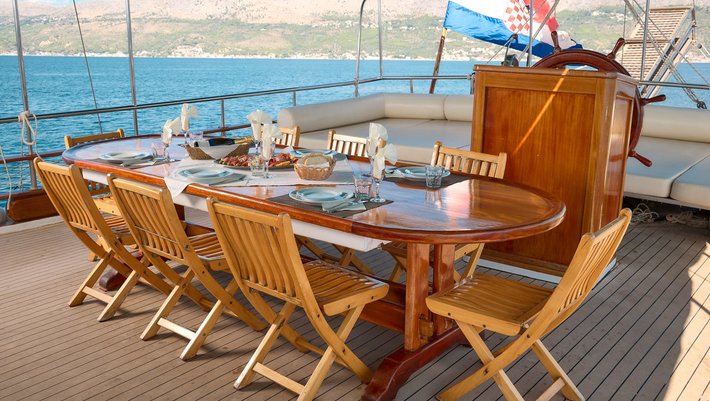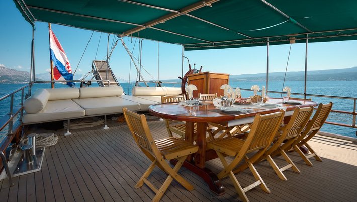 Amplia zona en popa con mesa y sillas para 12 personas