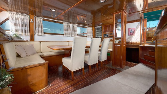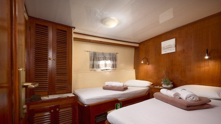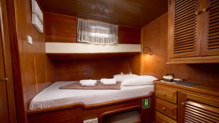 6 camarotes dobles todos con baño en suite y aire acondicionado. 5 camarotes con cama matrimonio y 1 con 2 camas individuales. Capacidad máxima 12 personas.