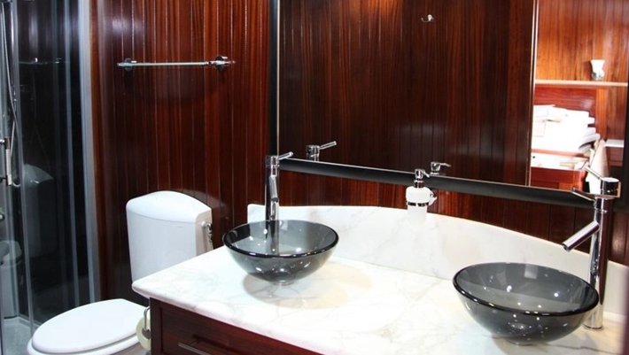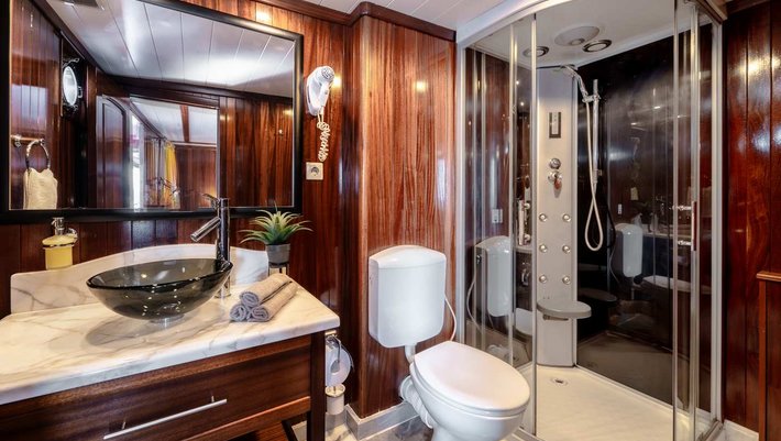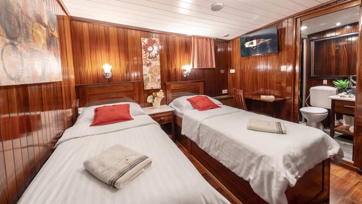 Todos los camarotes son amplios y decorados con paredes y suelos de caoba. El aire acondicionado es individual. Todas con baño privado en-suite. Los cuartos de baño incluyen ducha de masaje, encimera y suelos de mármol.
