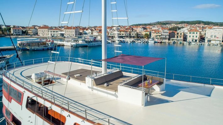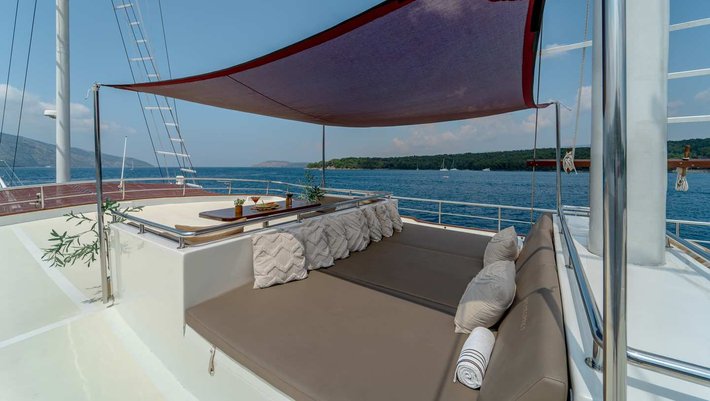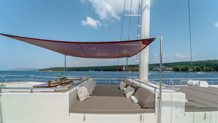 Cubierta de sol con terraza de teca grande (160m²) en la parte superior con tumbonas acolchadas para tomar el sol