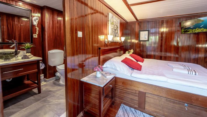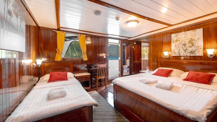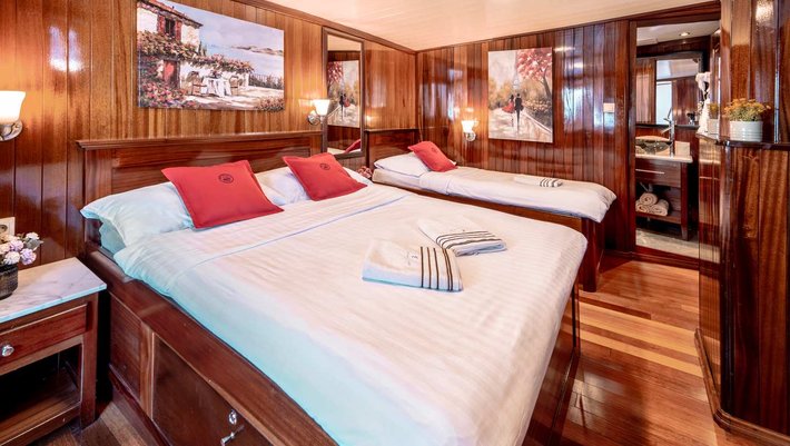 - 1 cabina VIP (22m²) con cama de matrimonio (160cm x 200cm) y cama individual (90cm x 200cm)
