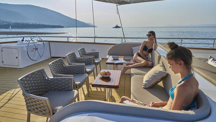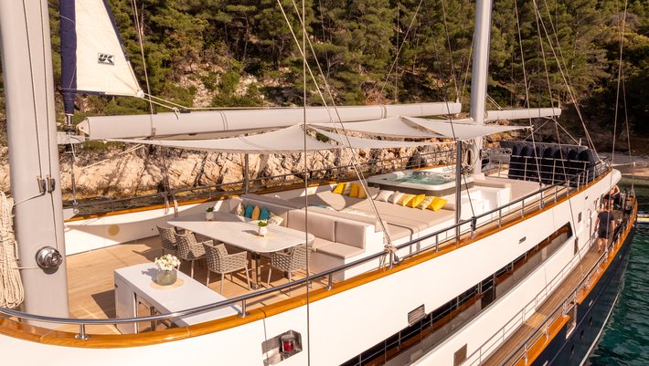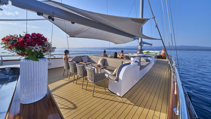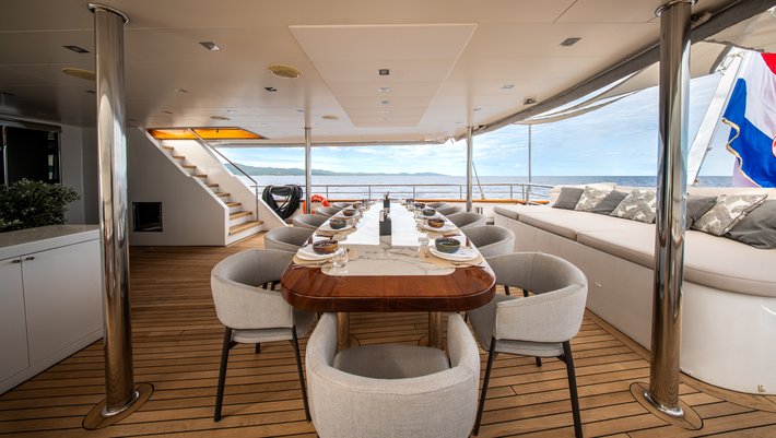 Amplia zona de almohadones en popa con zona de comedor exterior