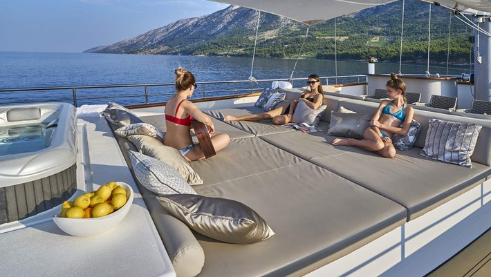 Espectacular solarium en la cubierta superior de 130m², con jacuzzi, colchonetas de sol y zona chill out con grandes toldo de sombra.