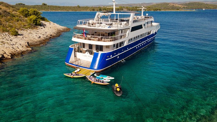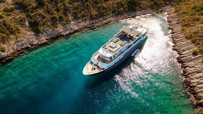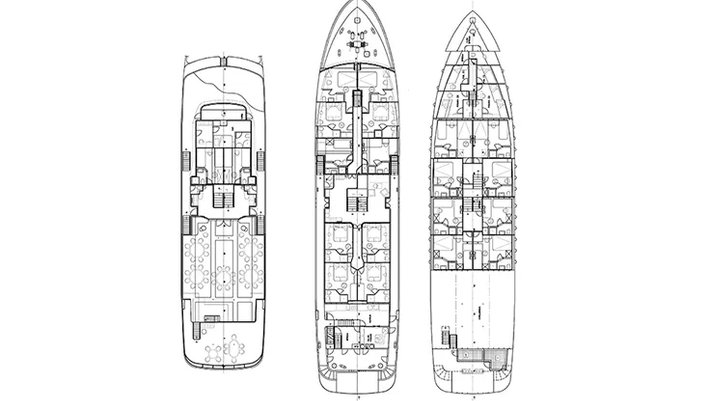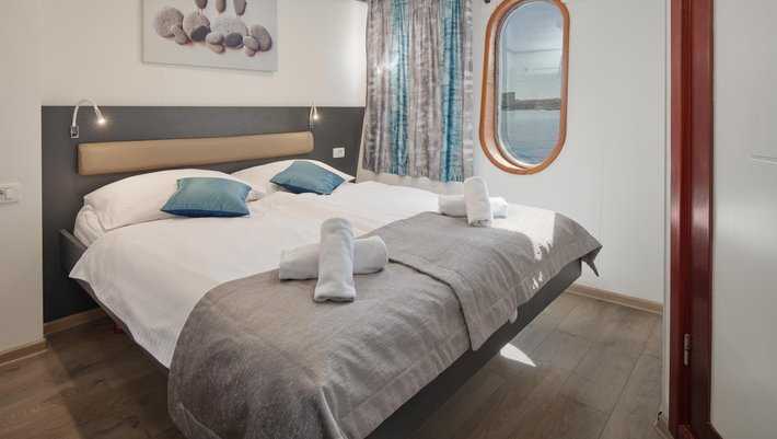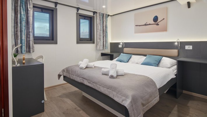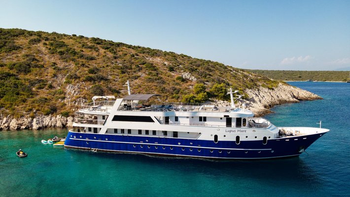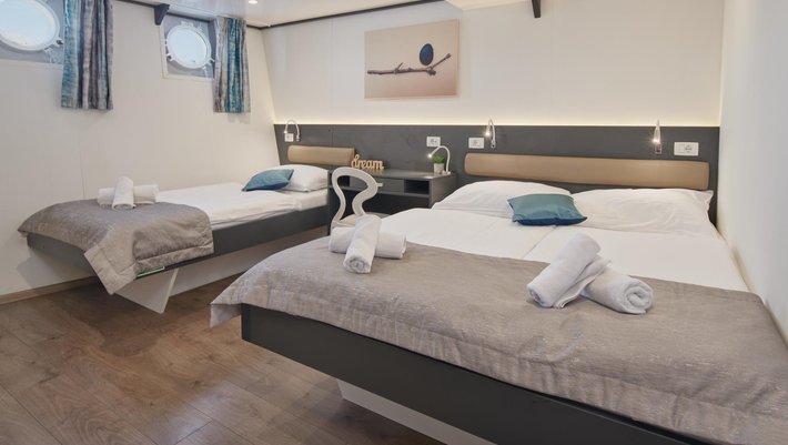 Lupus Mare cuenta con 15 cómodos camarotes: 8 con cama de matrimonio, 3 con camas individuales y 4 triples (cama de matrimonio + 1 cama individual. Capacidad máxima 34 pesonas. WC y ducha en cada camarote. Aire acondicionado individual en cada cabina.
