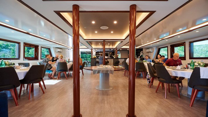 El área del salón cuenta con un hermoso espacio para comer, un bar completamente equipado y mucha luz natural. El salón interior y la comunicación entre cubiertas son únicos y brindan una experiencia de lujo en un hotel.