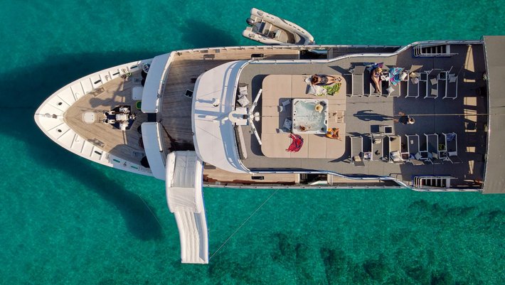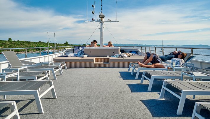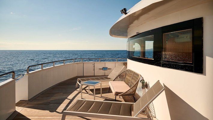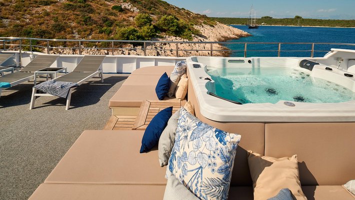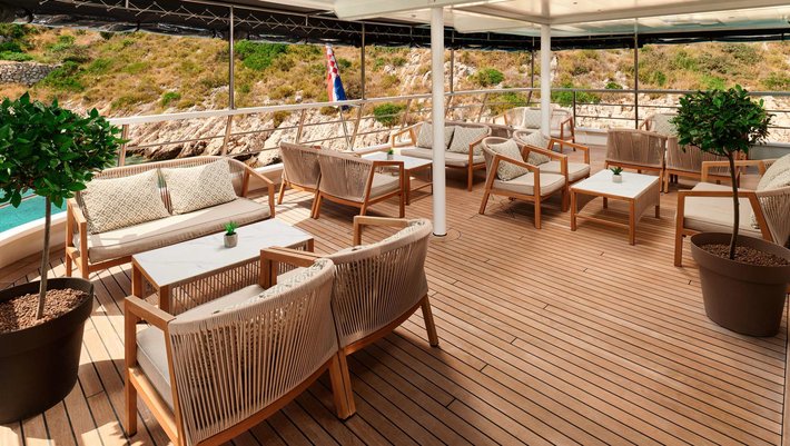 Amplios espacios exteriores diseñados para una relajación máxima: Con un hermoso y amplio salón con bar, mesas al aire libre en la popa, mostrador de recepción, una espaciosa terraza de 300 metros cuadrados y Jacuzzi.