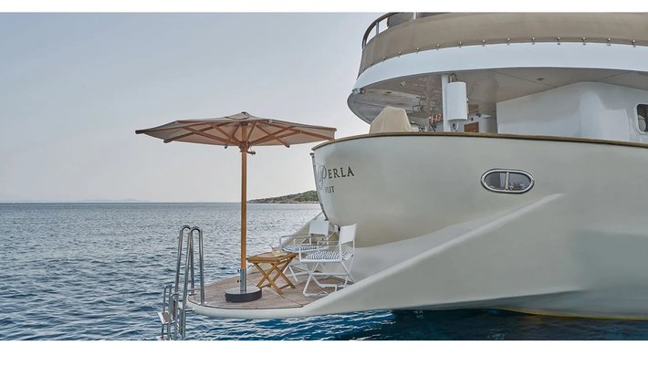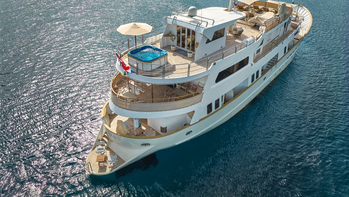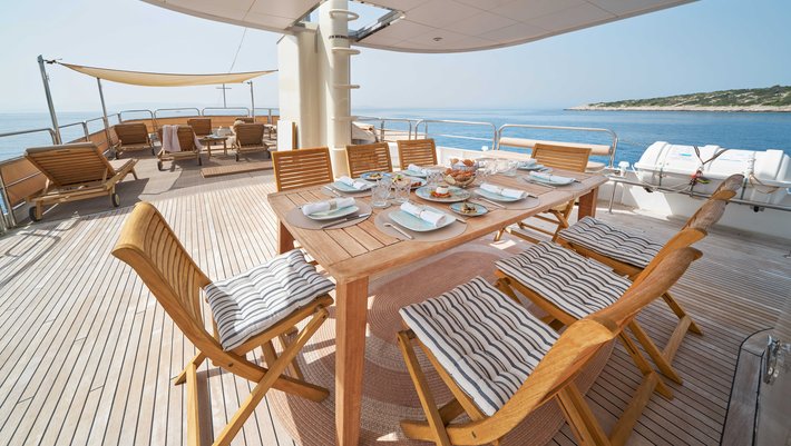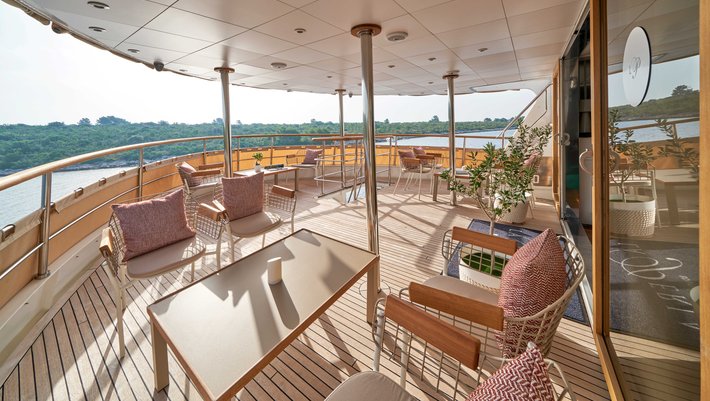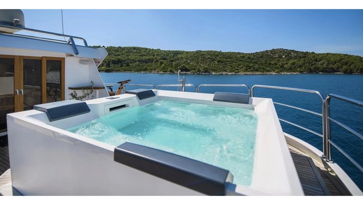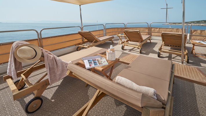 La zona de solarium se situa en la cubierta superior con múltiples tumbonas y jacuzzi.