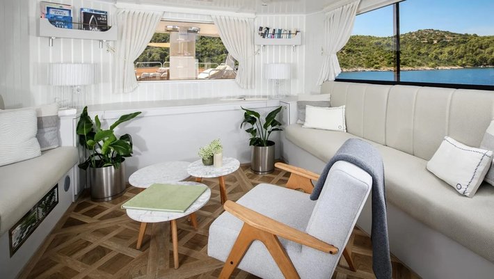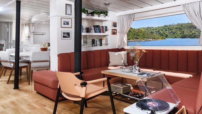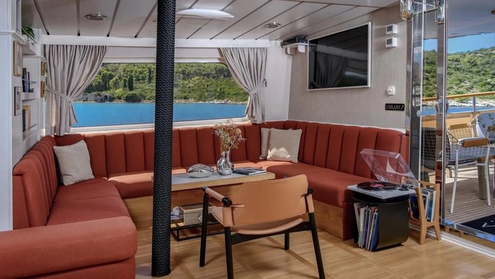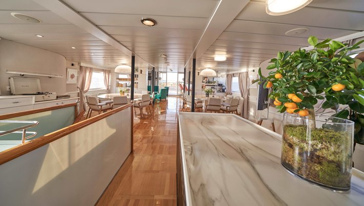En la cubierta segunda se encuentra el salón restaurante con salida a la terraza, bar y bibioteca