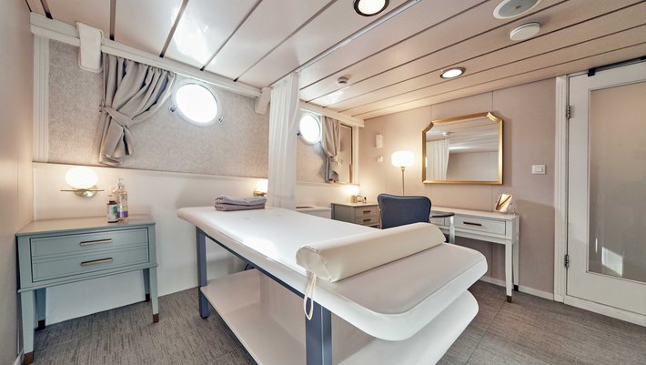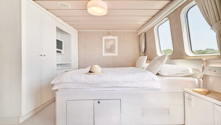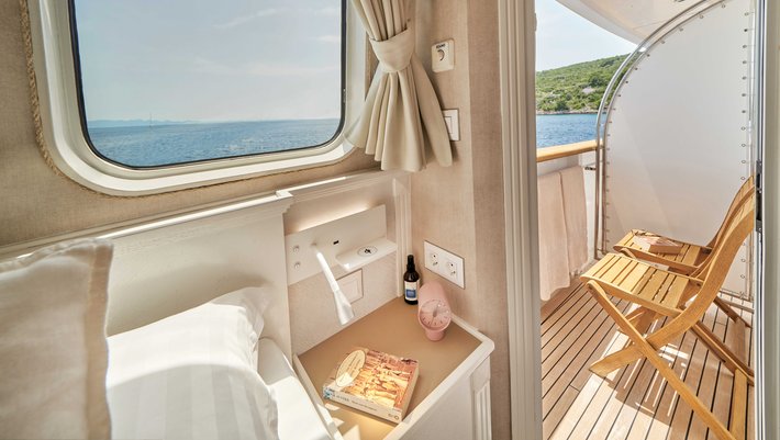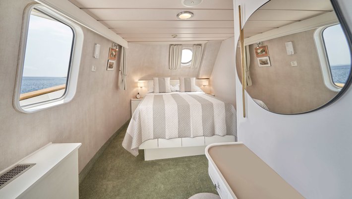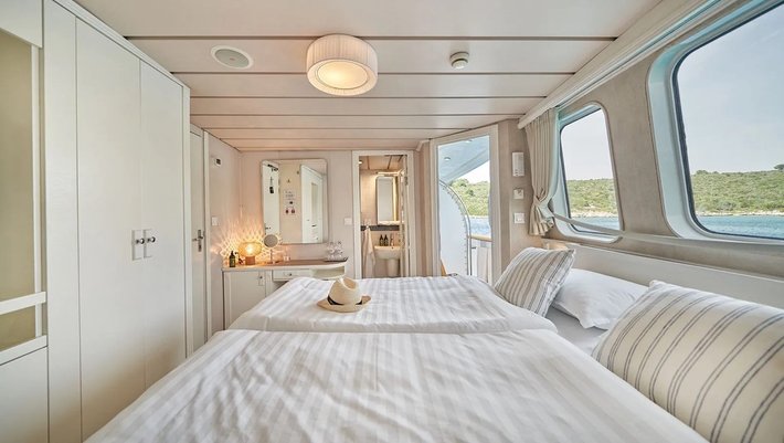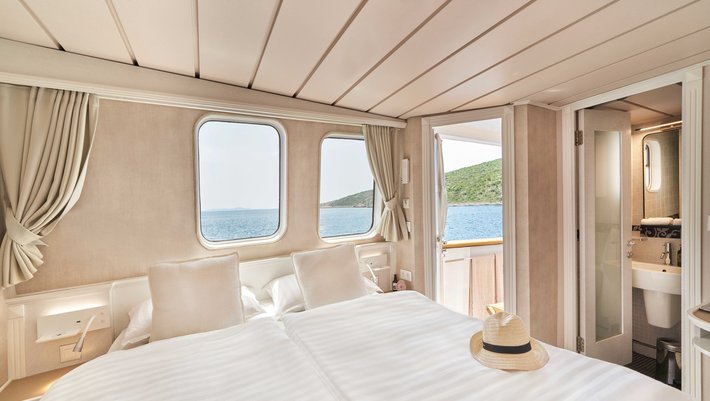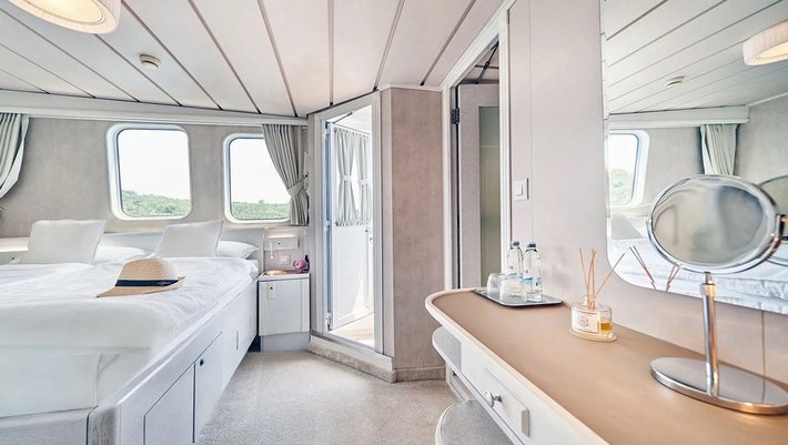 8 camarotes dobles todos amplios con baños en-suite, aire acondicionado y vista exterior. Todos se situan en la primera cubierta