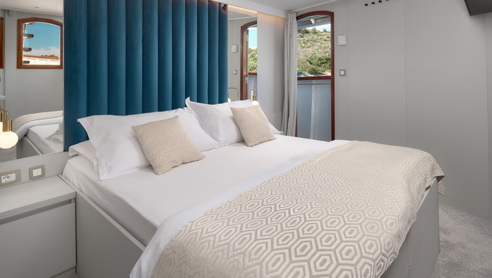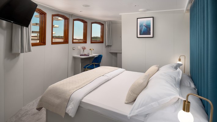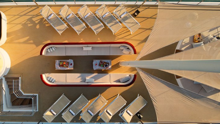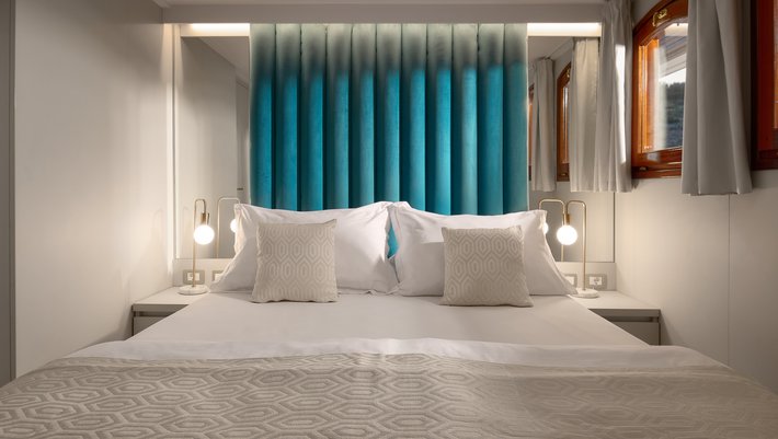 - Cubierta principal: 3 camarotes dobles y 7 camarotes convertibles en camas dobles o individuales, todos con baño en-suite