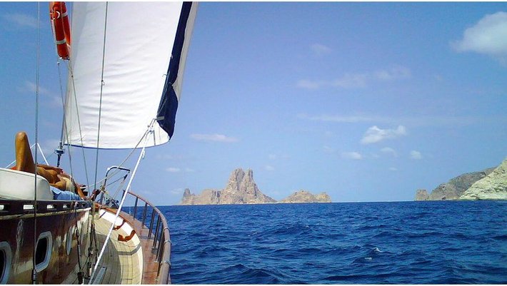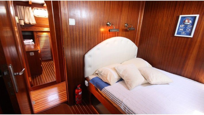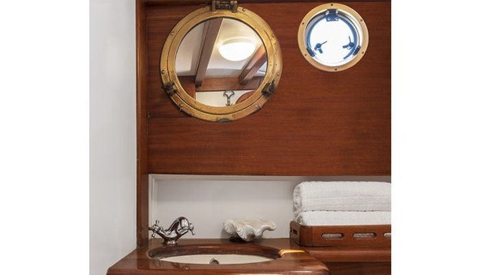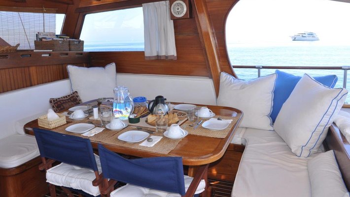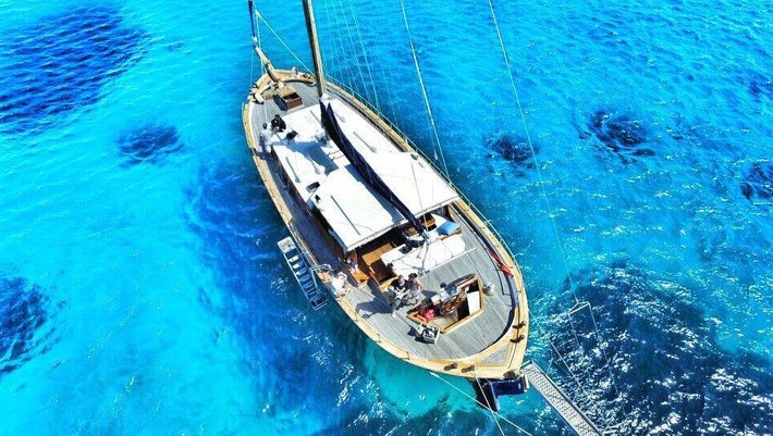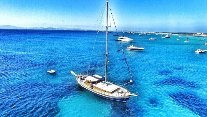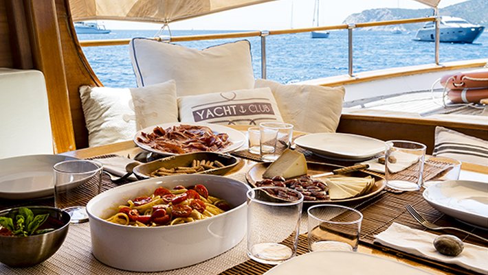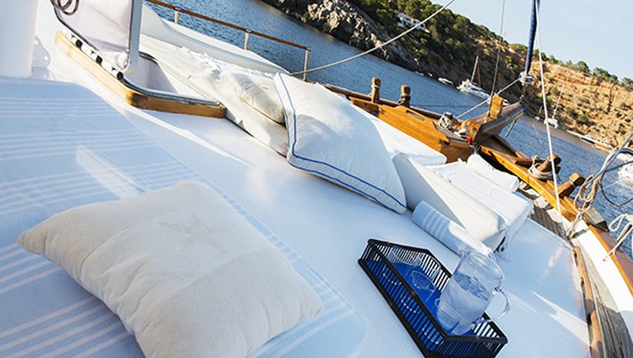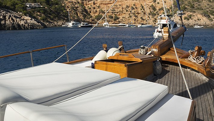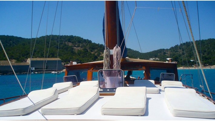 Notas: Todas las comidas a bordo son preparadas utilzando solamente productos frescos, preferibilmente ecológicos y nunca congelados. Los zumos de naranja exprimidos frescos son hechos con naranjas ibicencas de Santa Gertrudis. A bordo se utilizan exclusivamente platos de porcelana y vasos de cristal. Sabanas y Toallas son de puro algodón de Egypto. Bajo peticion (1 mes antes) podemos preaparar menú vegetarianos y especiales). Posibilidad de deportes acuáticos: Esquí, donut, wake board con cargo extra.