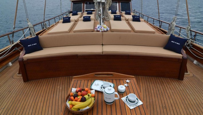 Mesa de comedor en la popa con un gran sofá relax