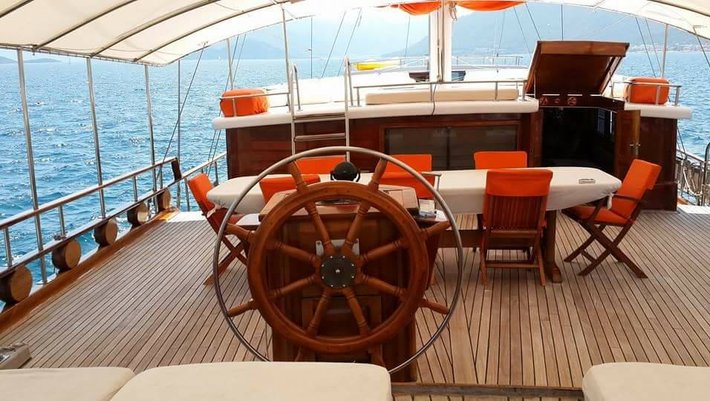 Dispone de dos zoas de comedor, una en popa con gran sofá de relax que ocupa toda la manga del barco y otra en la zona central de la cubierta
