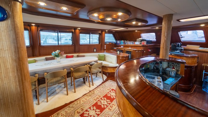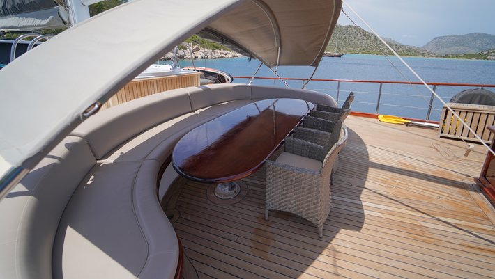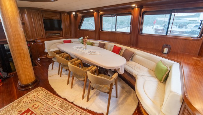 Zona de comedor en popa con mesa para 16 personas. Justo detrás se encuentra un gigante sofá de relax.