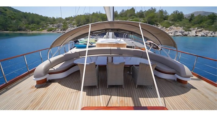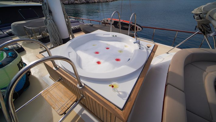 En proa se situa un amplio solarium con colchonetas y jacuzzi, asi como un banco con 2 mesitas ideal para aperitivos o cenas "al fresco"