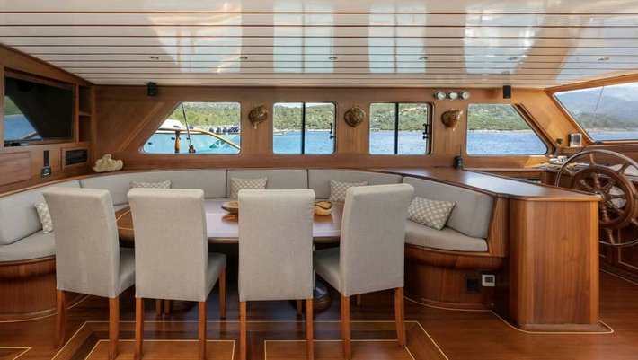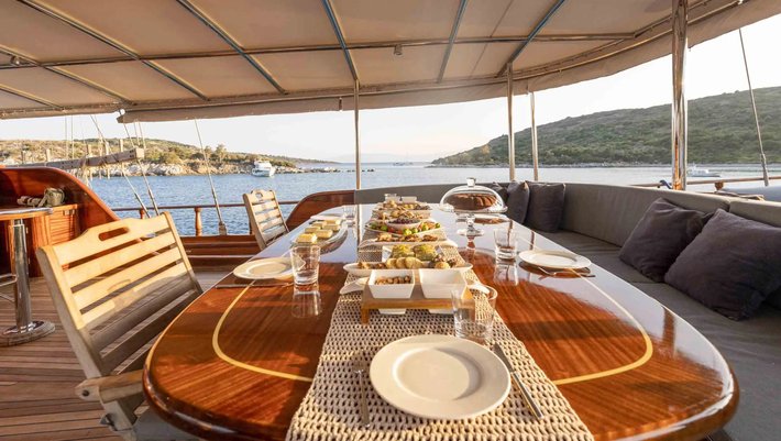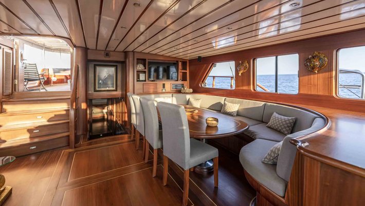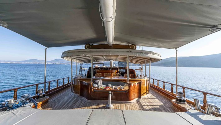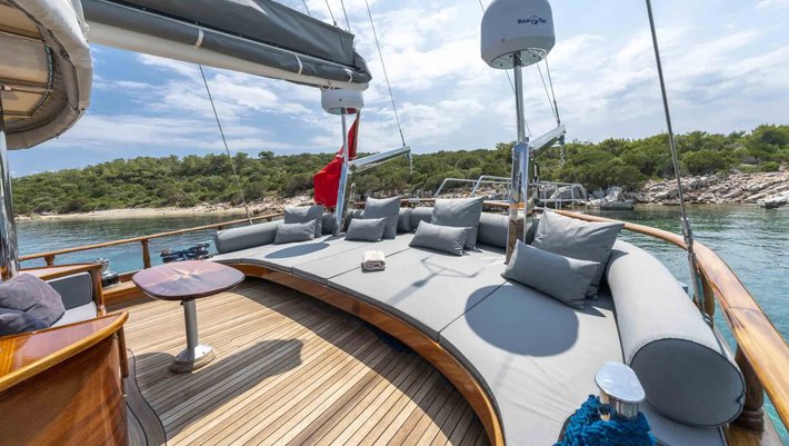 En su elegante popa se encuentra el comedor exterior y un gran sofá de relax.