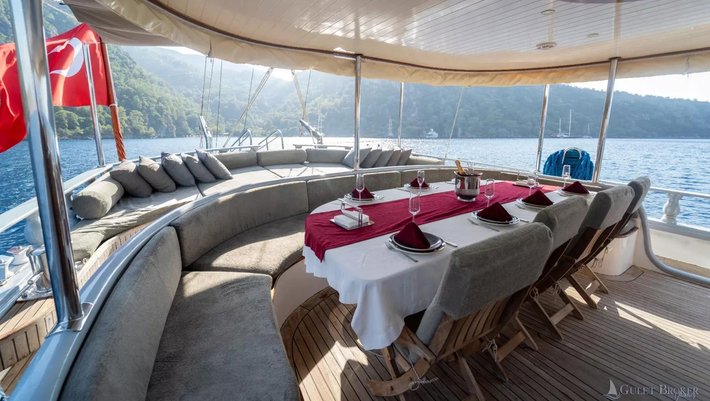 Amplia zona en popa con mesa de comedor y sofá.