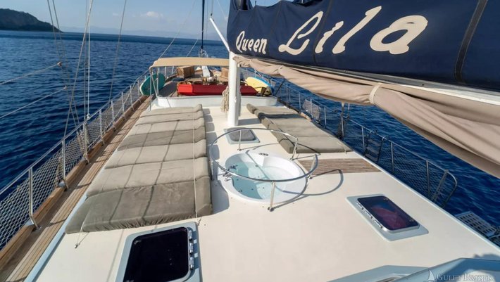 Amplio solarium en proa con colchonetas para 12 personas y jacuzzi.