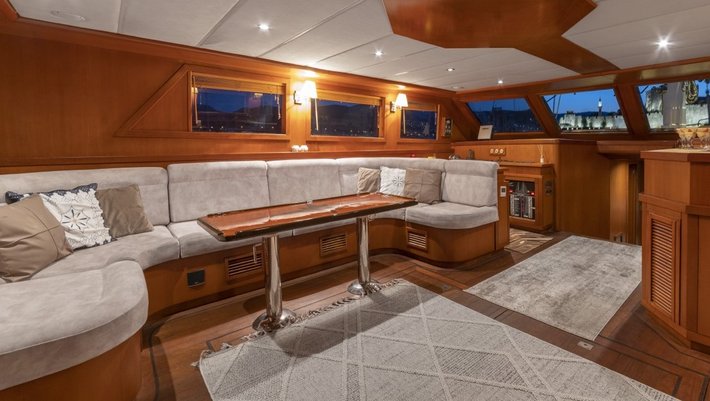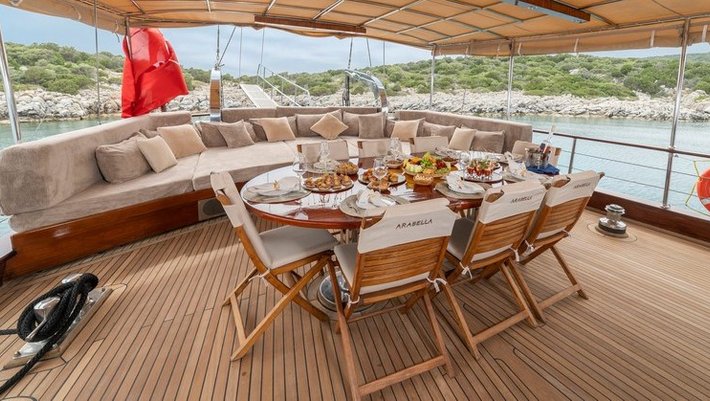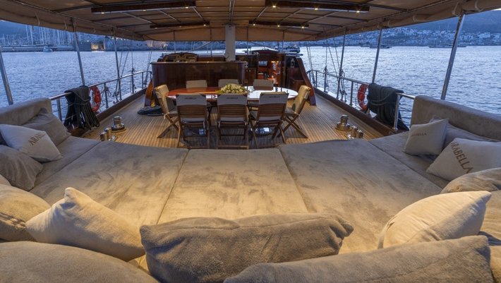 En popa se encuentra el comedor exterior con asientos cómodos y un gran sofá de relax.