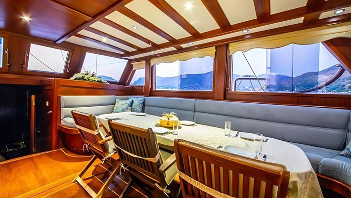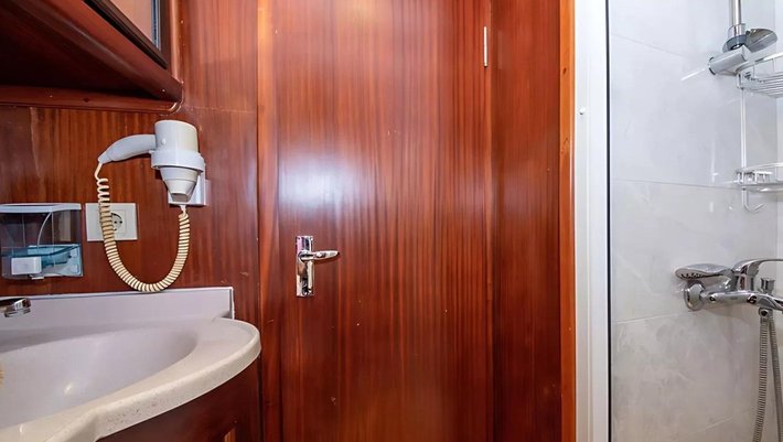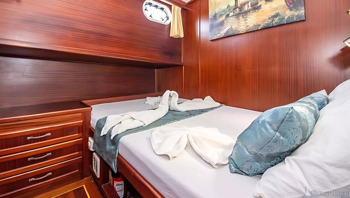 5 espaciosos camarotes dobles: 2 camarotes VIP, 2 con cama matrimonio y 1 con camas individuales. Baño en-suite y aire acondicionado en cada camarote. Capacidad hasta 10 personas
