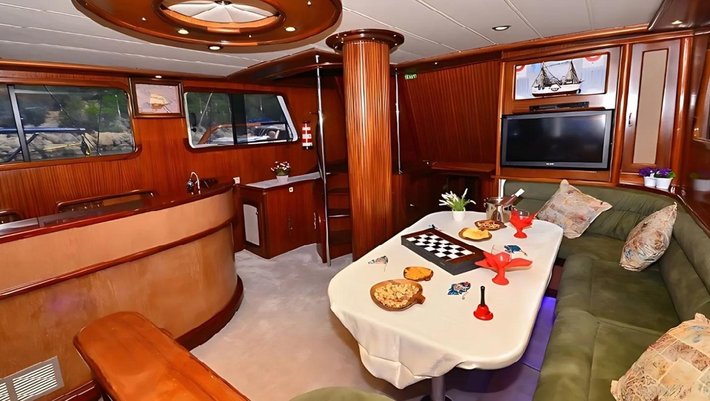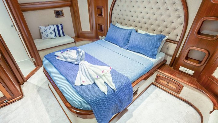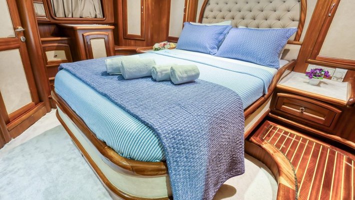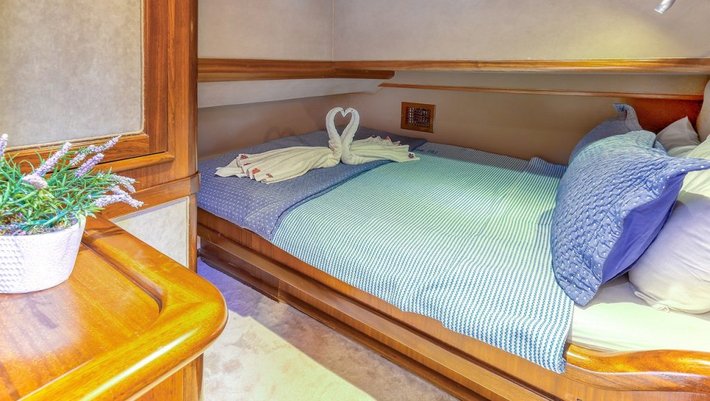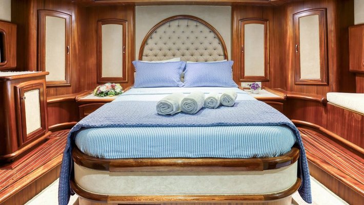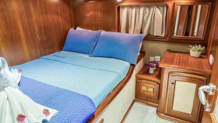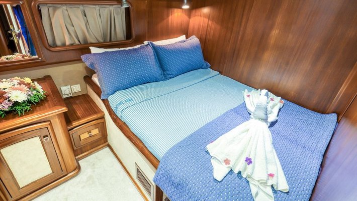 5 camarotes dobles: 2 master y 3 con camas dobles todos con baño en suite, aire acondicionado, TV y música. Capacidad: 10 personas.