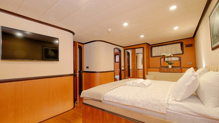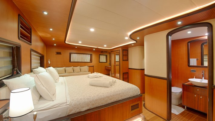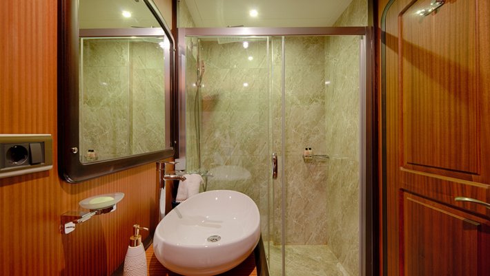 8 amplios y elegantes camarotes dobles: 2 principales y 4 con cama de matrimonio y 2 triples. Baño y aire acondicionado en cada camarote