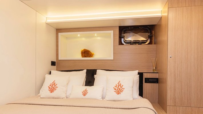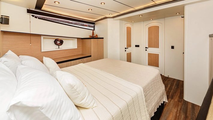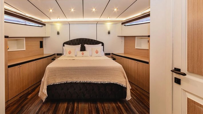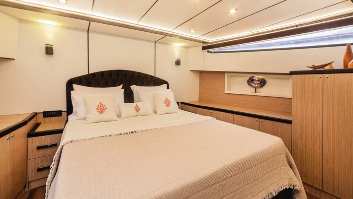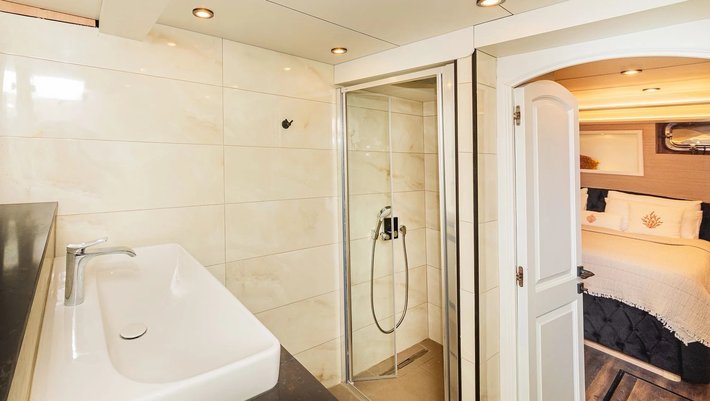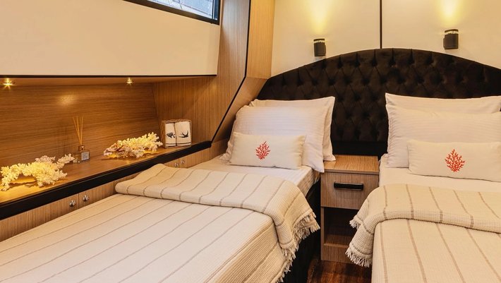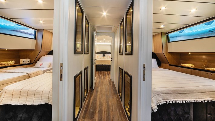 4 camarotes dobles: 1 principal Master, 1 VIP y 2 con camas individuales. Baño privado en cada camarote. Secador de pelo.