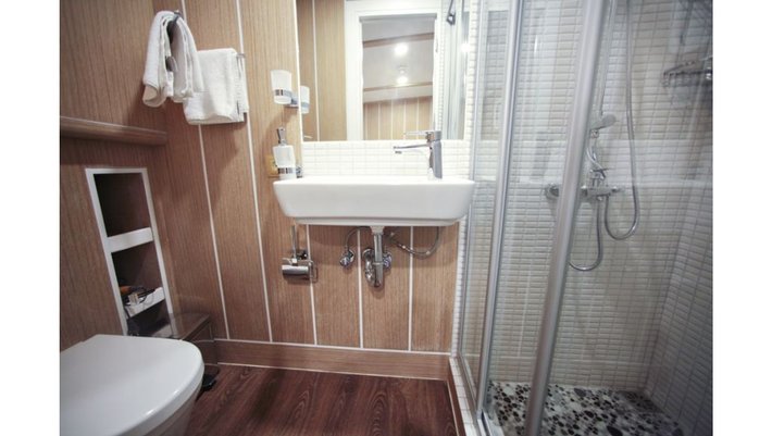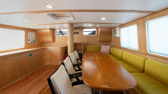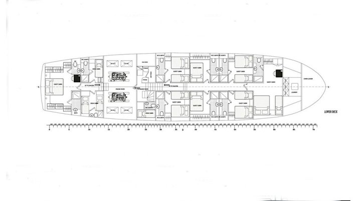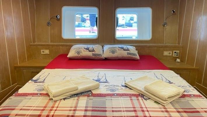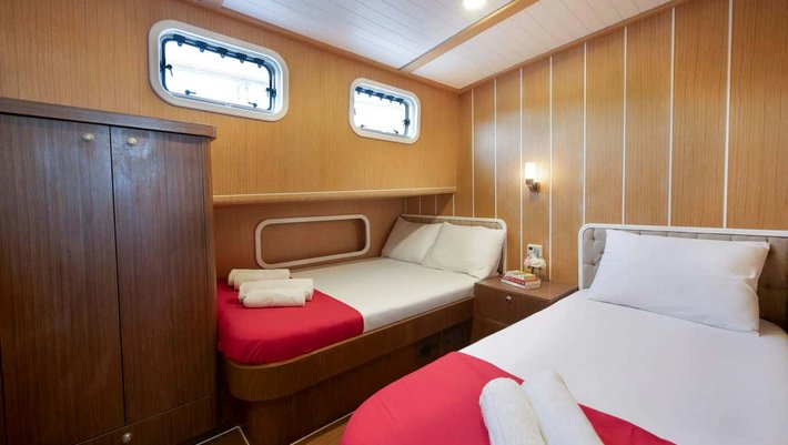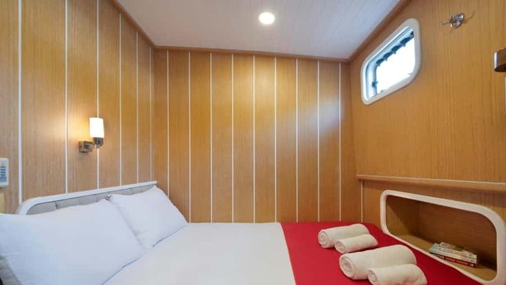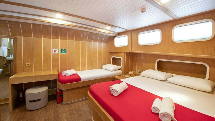 8 camarotes dobles: 2 master con cama extra individual, 2 dobles con cama de matrimonio y 4 triples con cama de matrimonio y cama individual. Todas con baño en-suite y aire acondiconado independiente. Capacidad máxima 22 personas