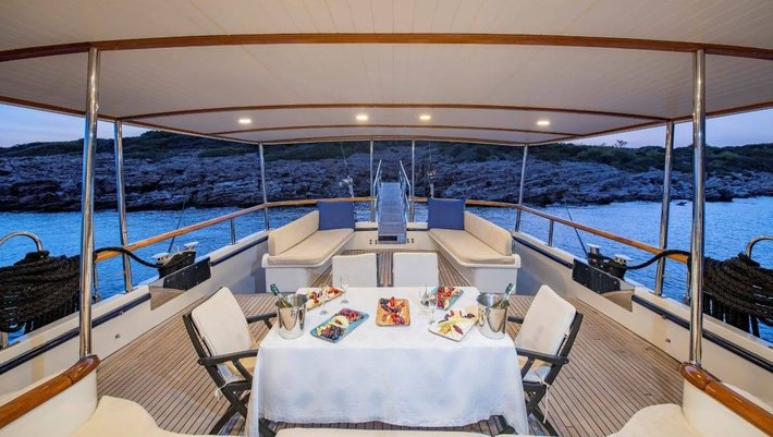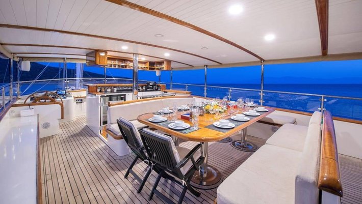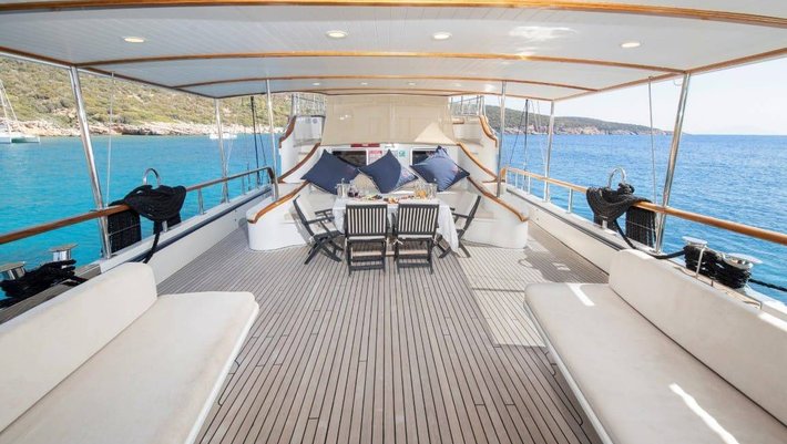 La zona de popa cuenta con amplios sofás y mesa de comedor para 6-8 personas.