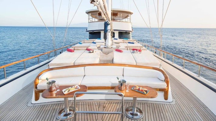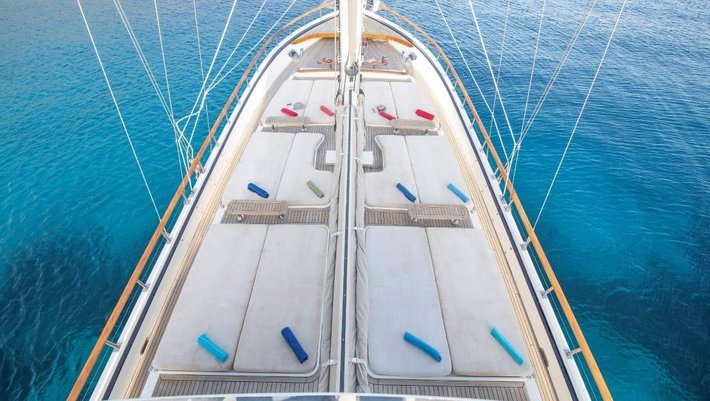 En proa se encuentra el solarium con colchonetas para aquellos que disfrutan del sol, así como un espacioso banco con mesitas ideal para aperitivo.