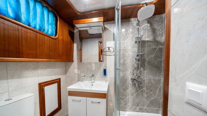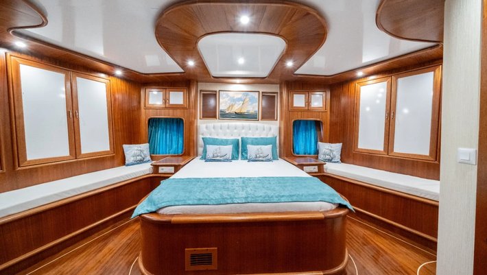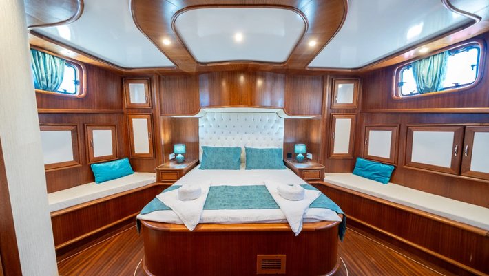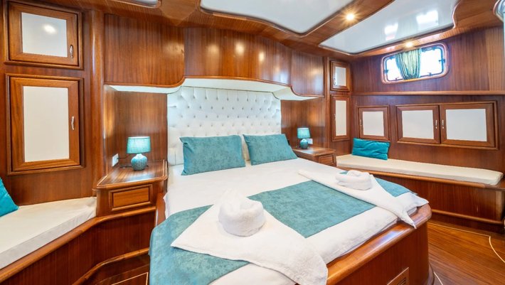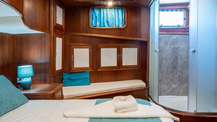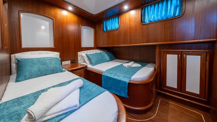 6 camarotes dobles: 2 principales, 2 camarotes dobles y 2 con camas individuales. Todos con baño en suite y aire acondicionado Capacidad máxima: 12 + 4 de tripulación en camarotes separados.