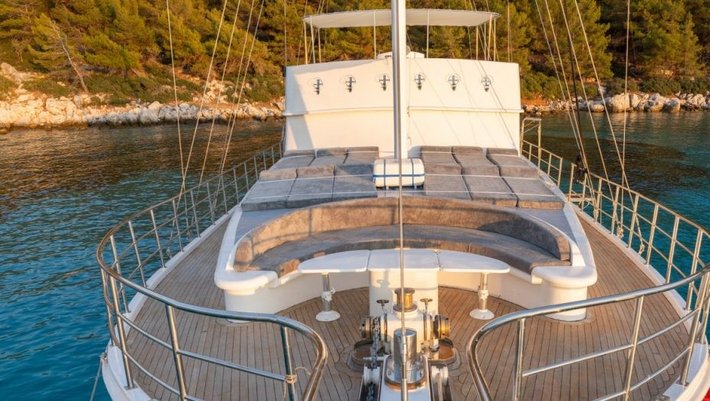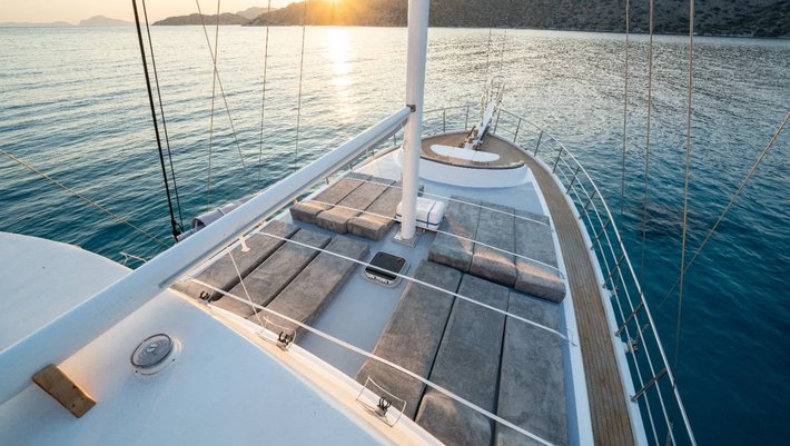 Amplio solarium en proa con banco y mesita, ideal para tomar el aperitivo.