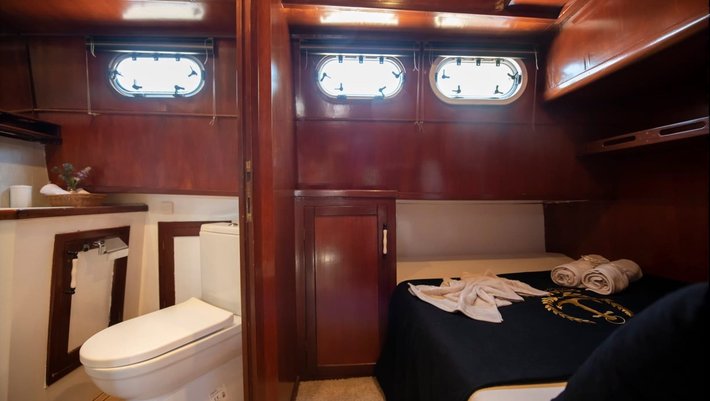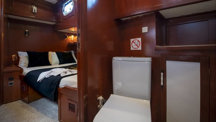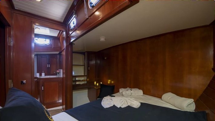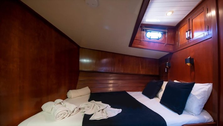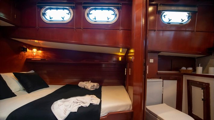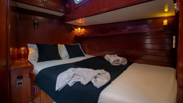 5 camarotes dobles con cama de matrimonio, todos con baño en-suite y aire acondicionado. Capacidad máxima 10 personas + 3 de tripulación.