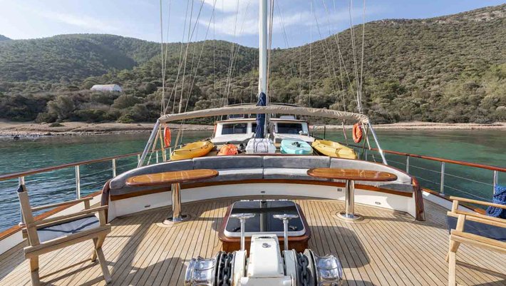 Solarium en proa con colchonetas de sol y un banco con 2 mesitas, ideal para tomar el aperitivo.