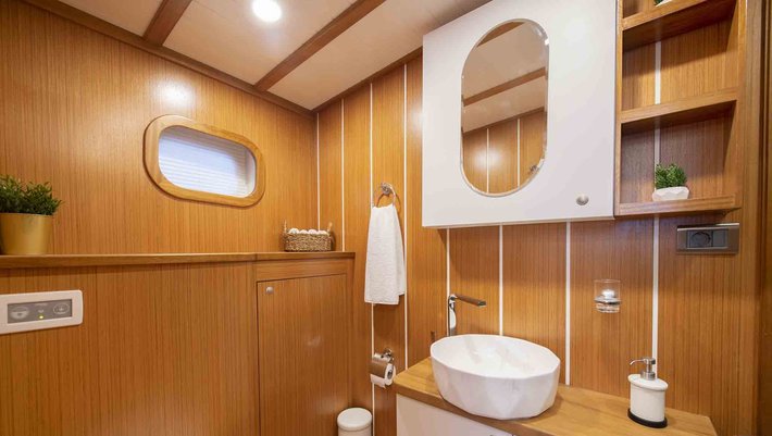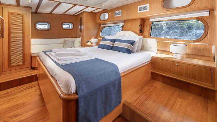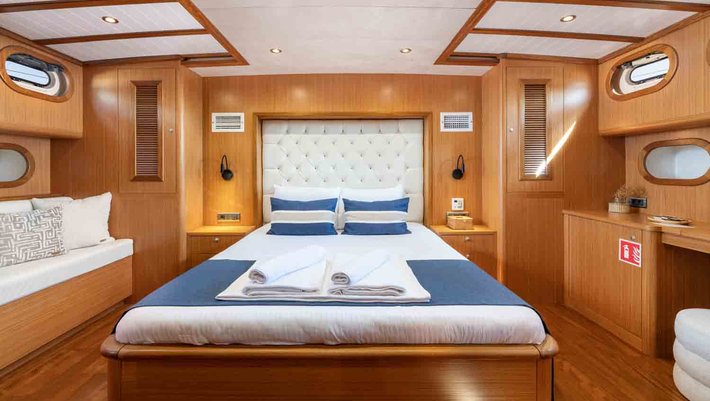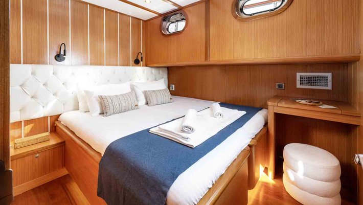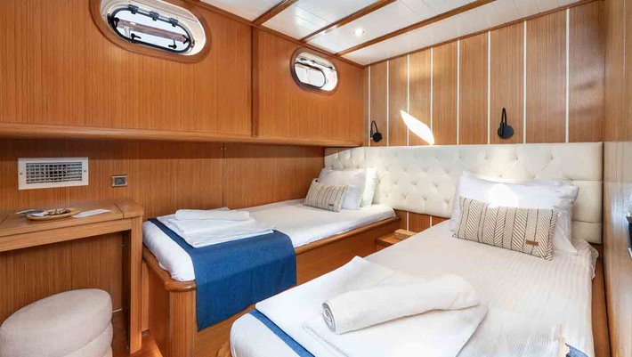 4 camarotes dobles: 2 principales y 1 doble que se puede convertir en 2 camas individuales y 1 con 2 individuales, todos con baño en-suite y aire acondicionado.