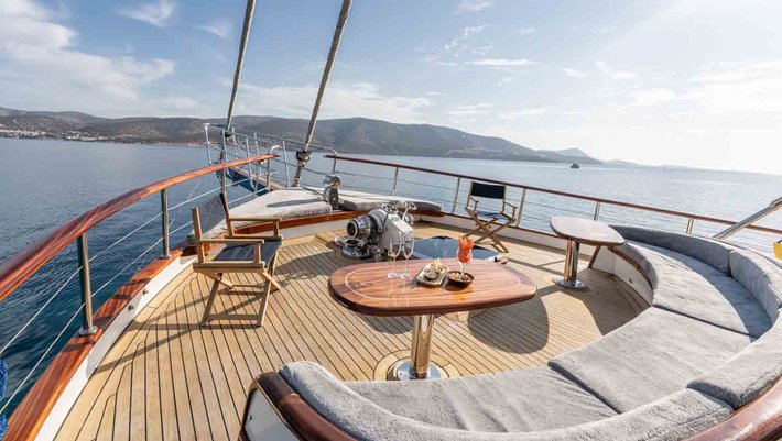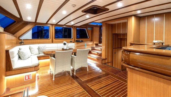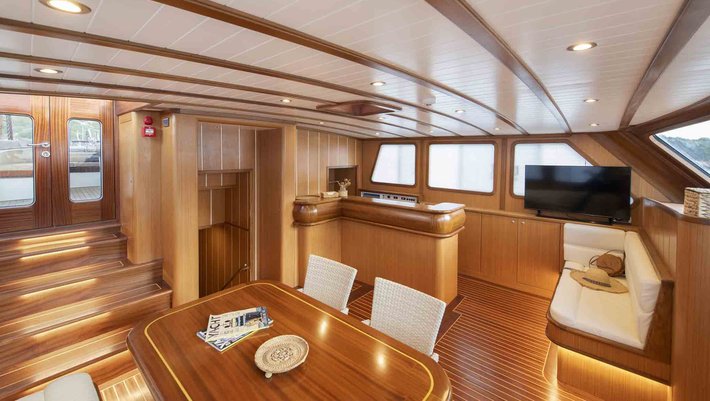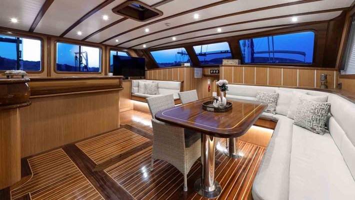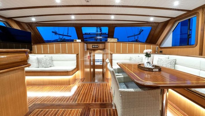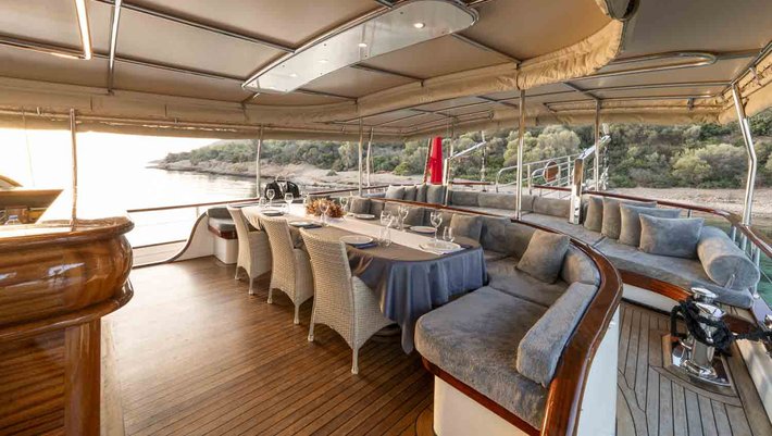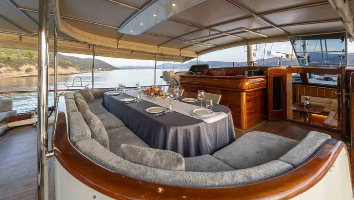 Comedor exterior para 8 personas se situa en la popa, junto con un gran sofá de relax que ocupa toda la manga del barco.