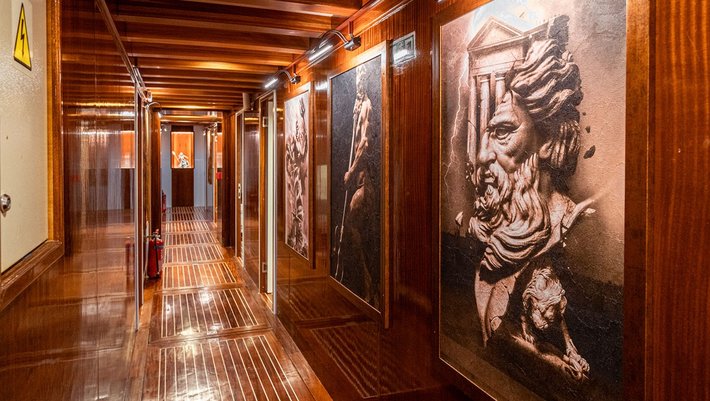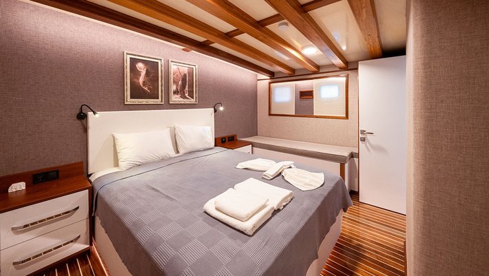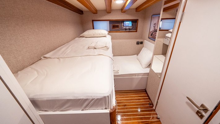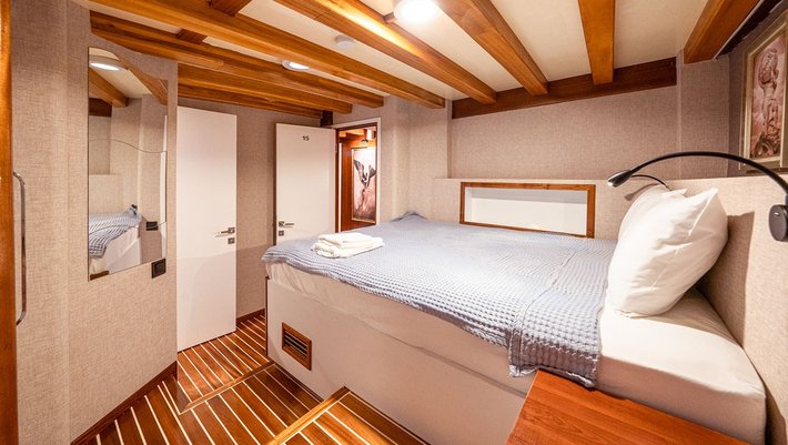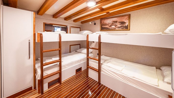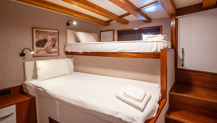 16 camarotes: 10 con cama de matrimonio, 4 con camas individuales y 2 cuádruples con 2 literas. Capacidad máxima 36 pasajeros.