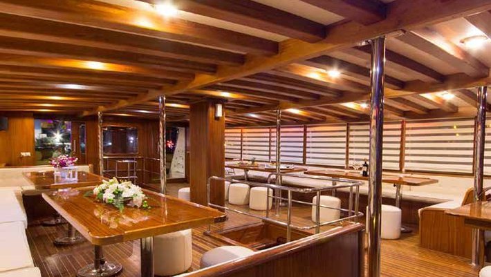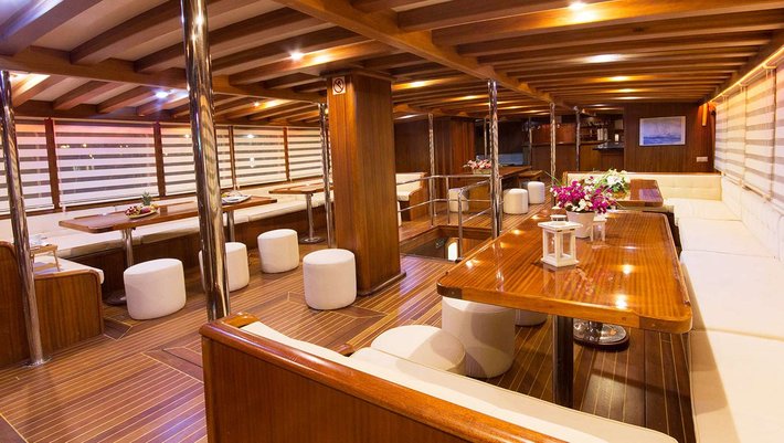 Amplia zona en popa con mesas de comedor y amplio sofá/solarium en la cubierta principal.