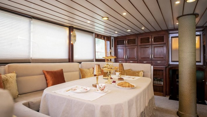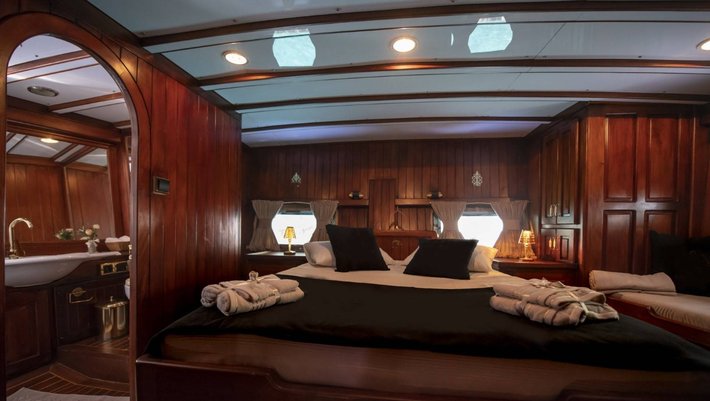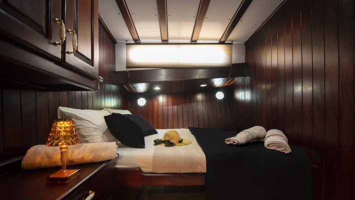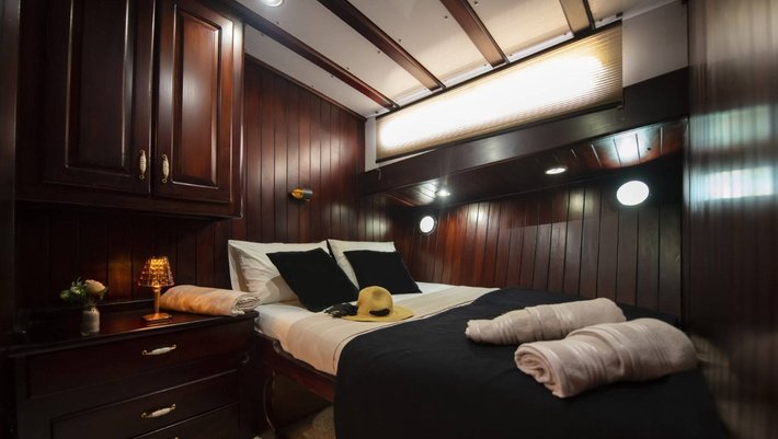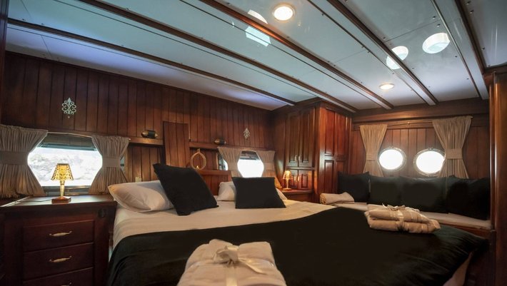 6 camarotes dobles: 1 principal, 4 dobles y 1 con litera, todas con baño en-suite y aire acondiconado independiente. Capacidad máxima 12 personas