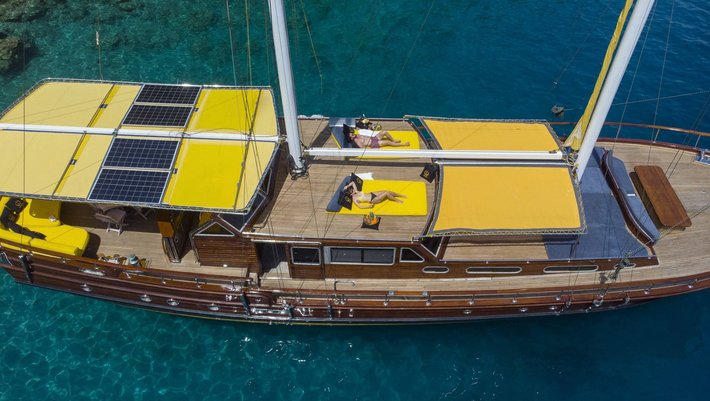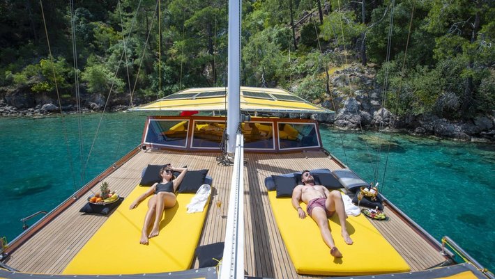 El solarium se encuentra situado en la proa del barco, con confortables colchonetas de sol